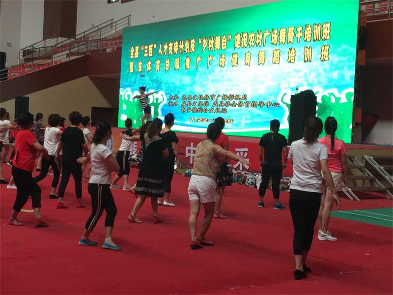 7月21日——7月27日,72886必赢“三下乡”社会实践“广场舞推广”服务团队在暑期社会实践期间,应甘肃省陇南地区成县文体广局要求,受省体育局社会体育管理中心委派,由张玉萍老师带领两名“广场舞推广”服务队员赶赴成县,承担由文体广局主办的全县“三区”人才支持计划及“乡村舞台”建设农村广场舞骨干的培训工作。在一周时间内,为成县学员系统培训2015年3月国家体育总局与文化部联合推出的12套广场舞健身操优秀示范作品,包括《倍儿爽》《今夜舞起来》《站在草原望北京》《策马奔腾》《广场style》《小苹果》《最炫民族风》《中国美》《中国味道》等9套健身操舞,以及快乐舞步健身操、按摩球韵律操《微笑》和活力健身操《自豪的建设者》。